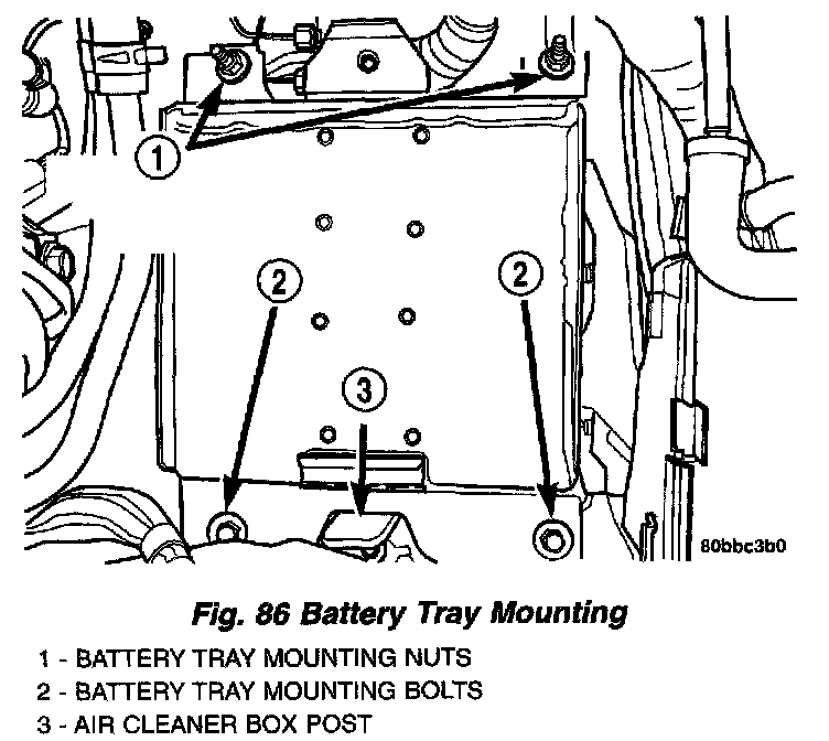 5. Remove the 2 bolts, then the 2 nuts mounting the battery tray to its bracket. Remove the battery tray.