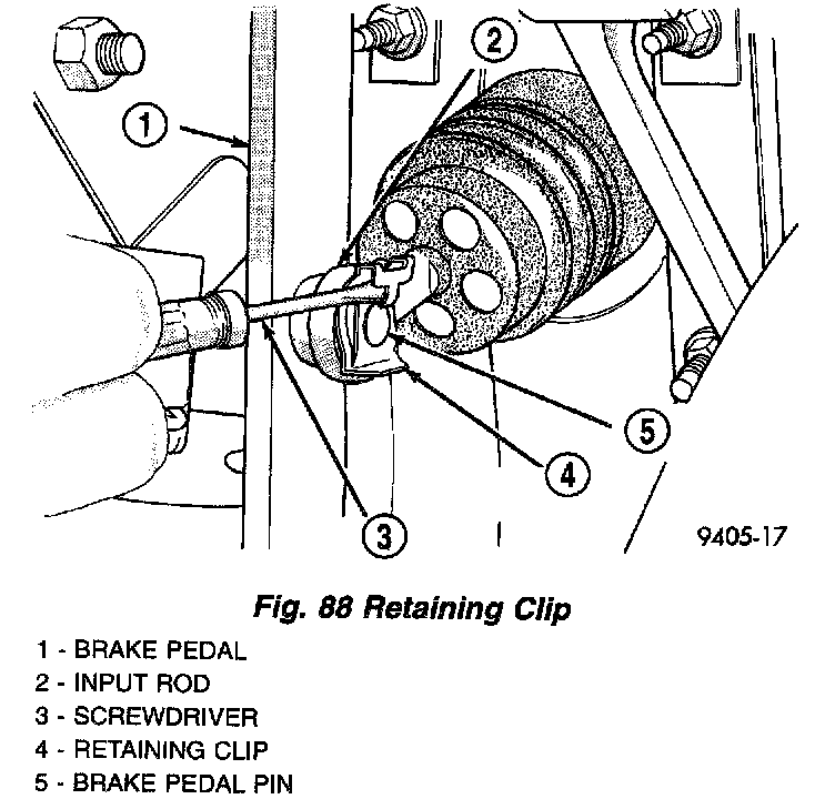 10. Locate the brake pedal-to-power brake booster input rod attachment under the instrument panel. Position a small screwdriver under the center tang of the retaining clip. Rotate the screwdriver enough to allow the retaining clip tang to pass over the end of the brake pedal pin. Remove the clip.