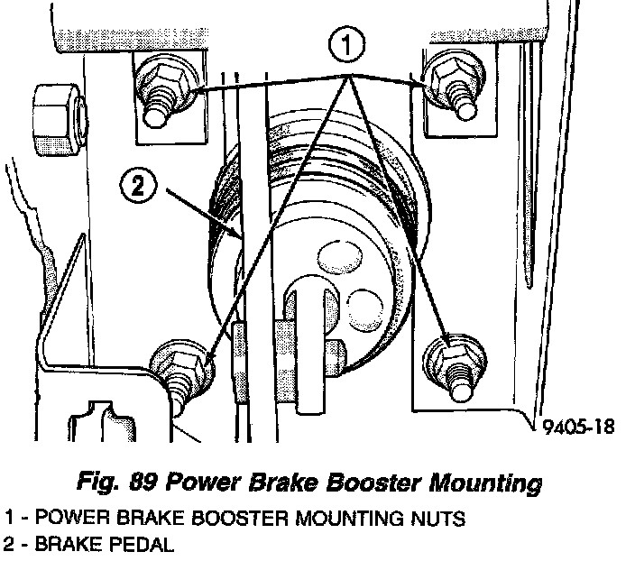 11. Remove the four nuts attaching the power brake booster to the instrument panel. The nuts are accessible from under the instrument panel in the area of the brake pedal bracket.