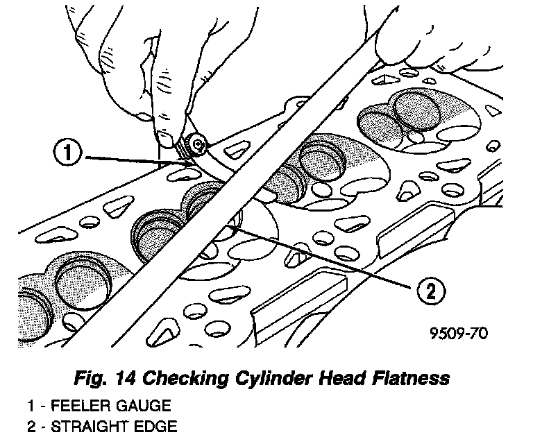 1. Cylinder head must be flat within 0.1 mm (0.004 inch) (Fig. 14).