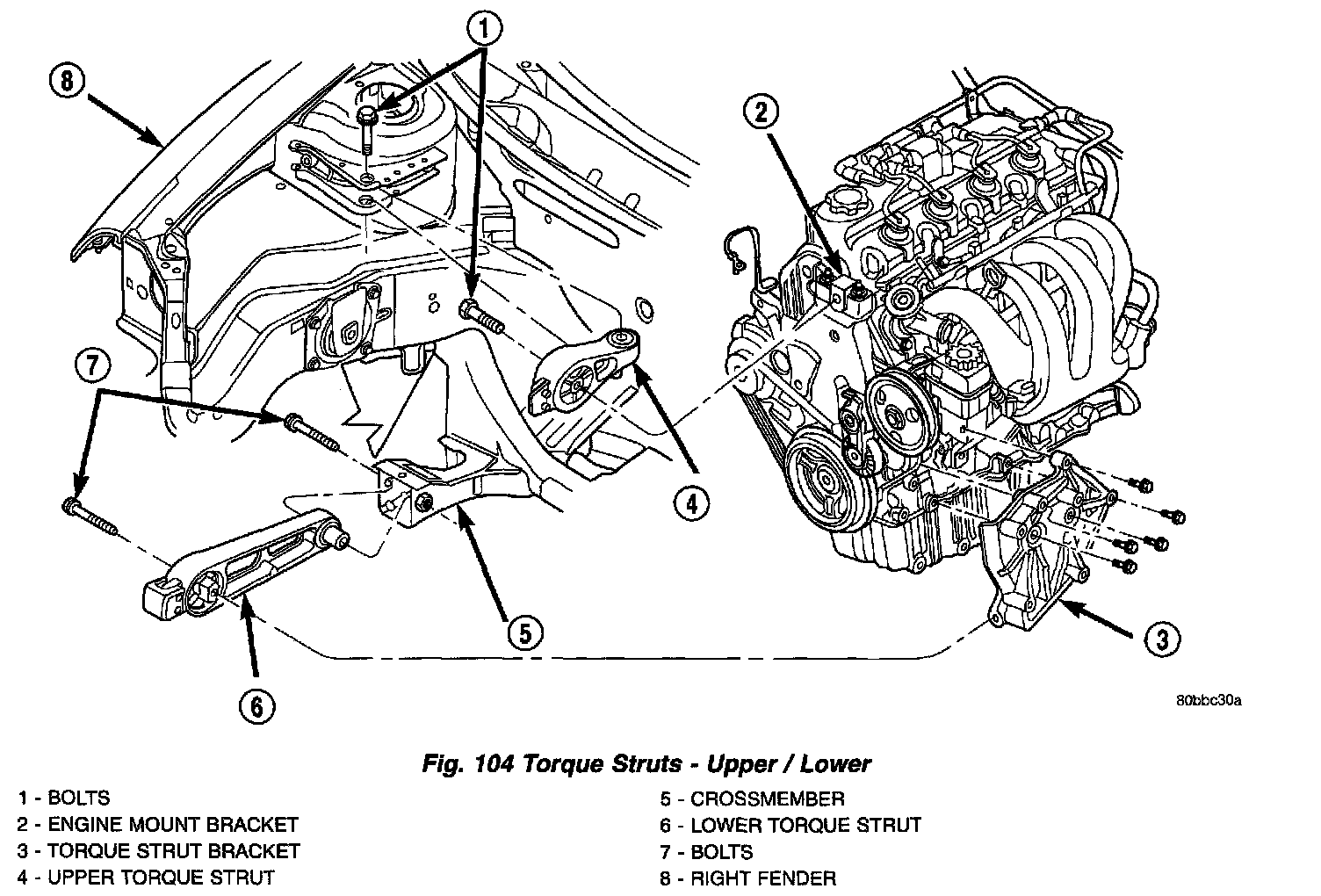 1. Position the upper torque strut into mounting locations (Fig. 104).