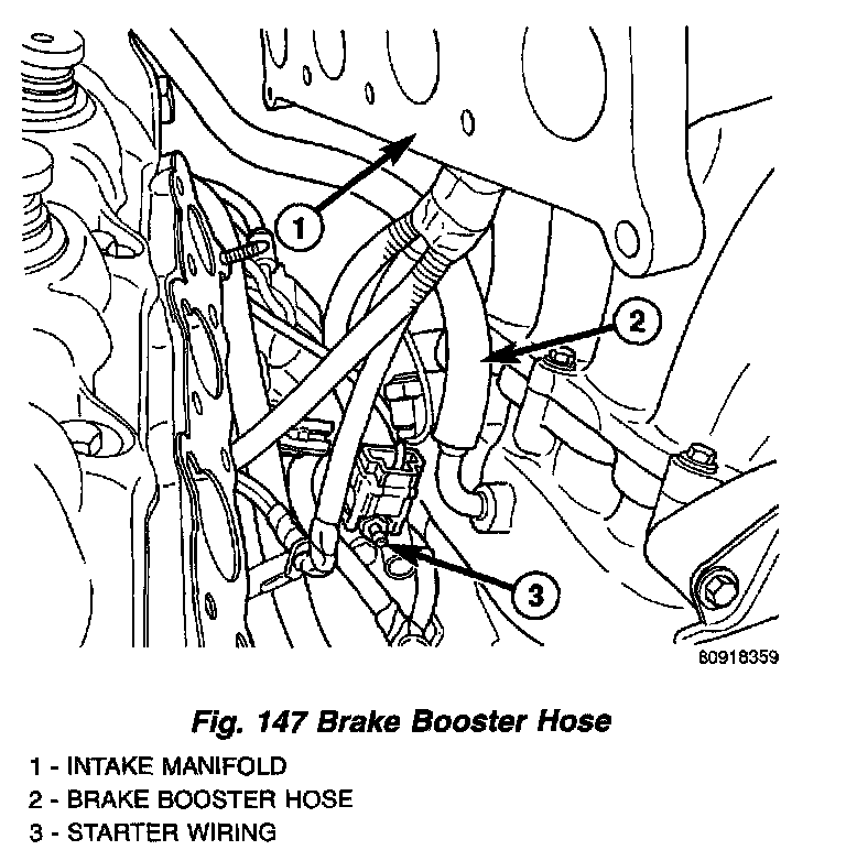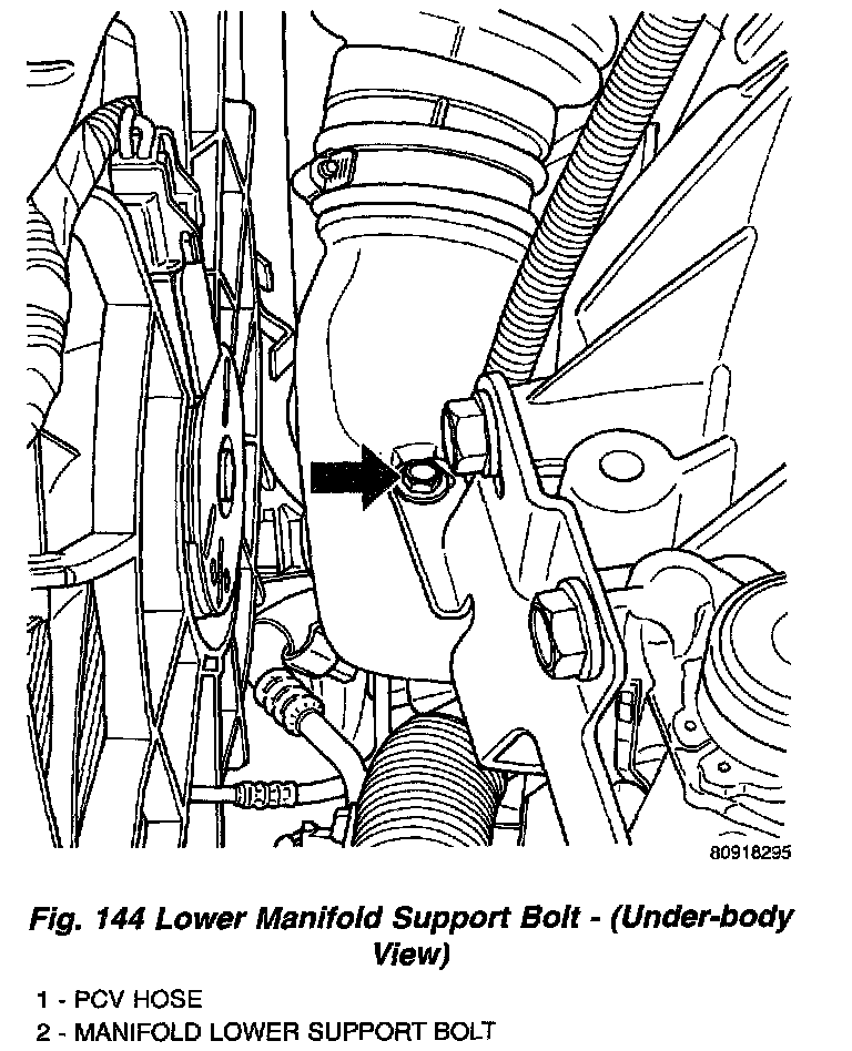 9. Install bolt securing lower manifold to bracket (Fig. 144). Tighten bolt to 28 Nm (250 in. lbs.).