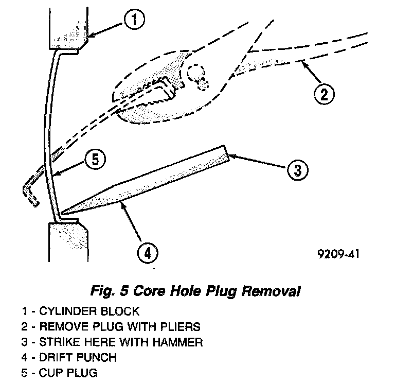 Using a blunt tool such as a drift and a hammer, strike the bottom edge of the cup plug. With the cup plug rotated, grasp firmly with pliers or other suitable tool and remove plug (Fig. 5).