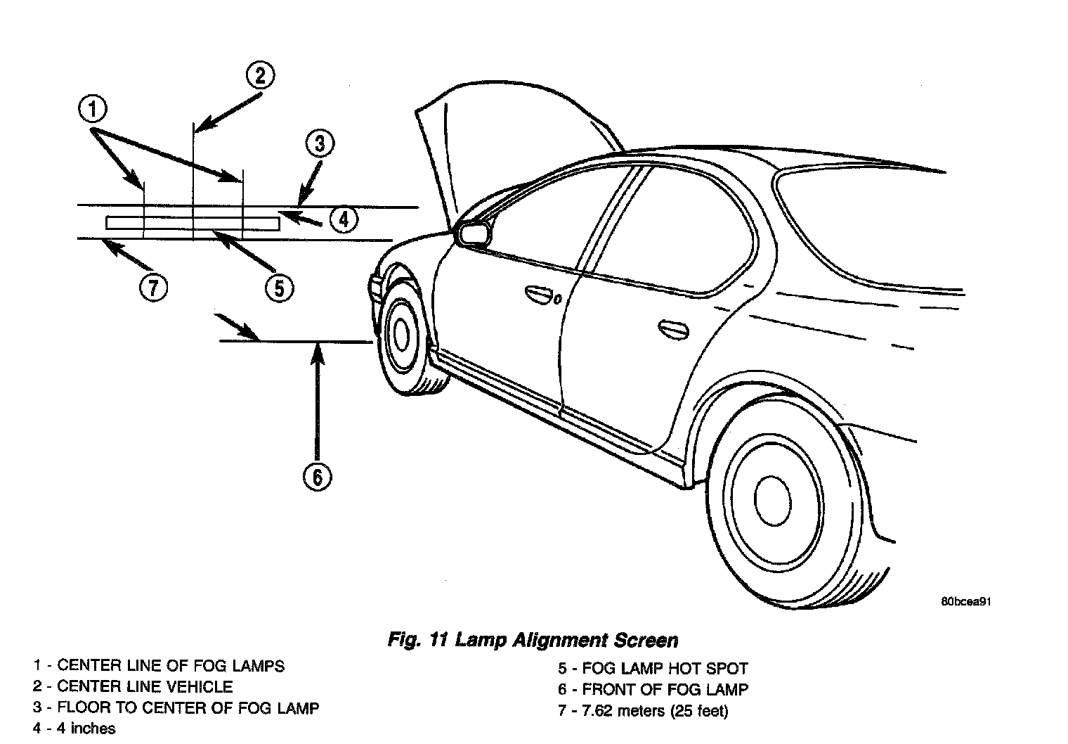 Prepare an alignment screen. (Refer to HEADLAMP UNIT - ADJUSTMENTS). Disengage the wire connectors from the back of the headlamp bulbs to disable the headlamps. This will allow a more accurate projection reading of the fog lamps. Turn ON the headlamp switch and actuate the fog lamp switch. A properly aligned fog lamp will project a pattern on the alignment screen 100 mm (4 in.) below the fog lamp center line and straight aheadFig.11 Lamp Alignment Screen: