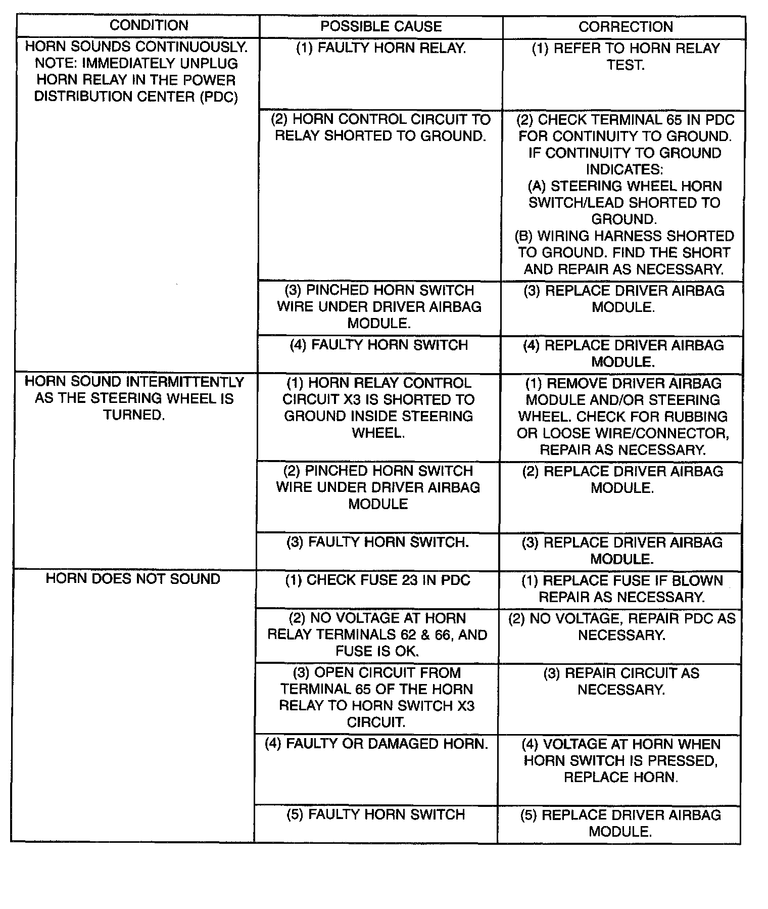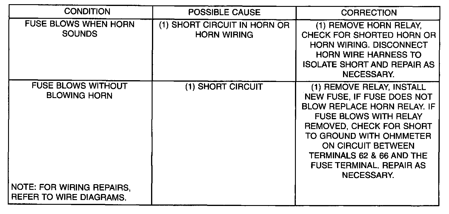 Refer to Horn System Test table. If the horn does not sound, check the horn fuse located in the Power Distribution Center. If the fuse is blown, replace with the correct fuse. If the horn fails to sound and the new fuse blows when depressing the horn switch, a short circuit in the horn or the horn wiring between the fuse terminal and the horn is responsible, or a defective horn switch allowed the horn to burn out is responsible.