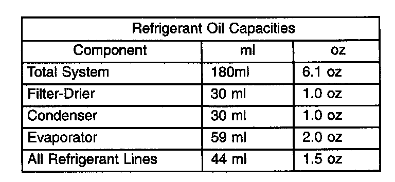 When an air conditioning system is first assembled, all components (except the compressor) are refrigerant oil free. After the system has been charged with R-134a refrigerant and operated, the oil in the compressor is dispersed through the lines and components. The evaporator, condenser, and filter- drier will retain a significant amount of oil, refer to the Refrigerant Oil Capacities chart. When a component is replaced, the specified amount of refrigerant oil must be added. When the compressor is replaced, the amount of oil that is retained in the rest of the system must be drained from the replacement compressor. When a line or component has ruptured and oil has escaped, the compressor should be removed and drained. The filter-drier must be replaced along with the ruptured part. The oil capacity of the system, minus the amount of oil still in the remaining components, can be measured and poured into the suction port of the compressor.