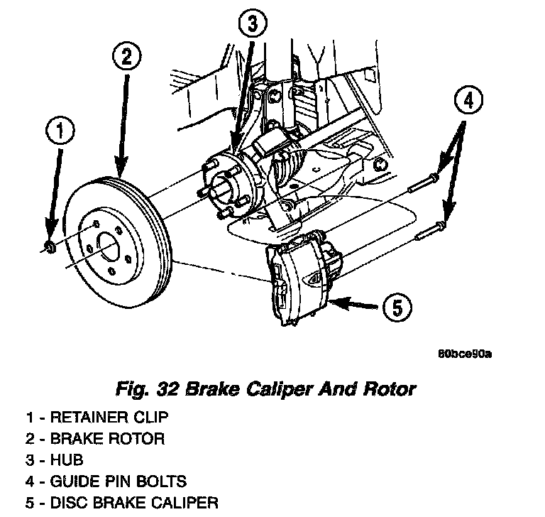 3. Remove the two guide pin bolts securing the front disc brake caliper to the steering knuckle.