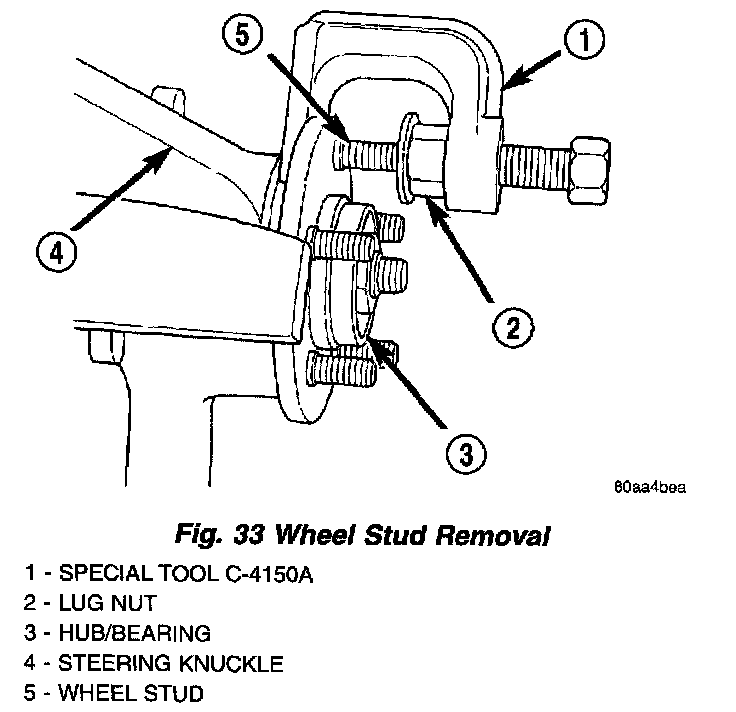 7. Install a wheel mounting nut on the wheel mounting stud being removed from the hub far enough so the threads on the stud are even with end of lug nut. Rotate the hub so the stud requiring removal is aligned with notch cast into front of the steering knuckle. Install Remover, Special Tool C-4150A, on hub flange and wheel stud.