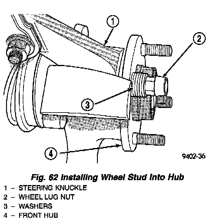 2. Tighten the wheel mounting nut. This will pull the wheel mounting stud into the flange of the hub. When the head of the stud is fully seated against the rear of the hub flange, remove the wheel mounting nut and washers from the stud.