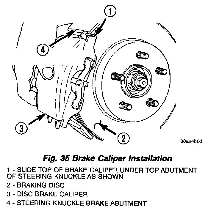 4. Install the disc brake caliper (with pads) on the brake rotor and steering knuckle. The left side caliper is installed by first sliding the top of the caliper past the top abutment on the steering knuckle to hook the top edge of the caliper, then pushing the lower end of the caliper into place against the knuckle. The right side caliper is installed by first sliding the bottom edge of the caliper past the lower abutment on the steering knuckle to hook the lower edge of the caliper, then pushing the top of the caliper into place against the steering knuckle.