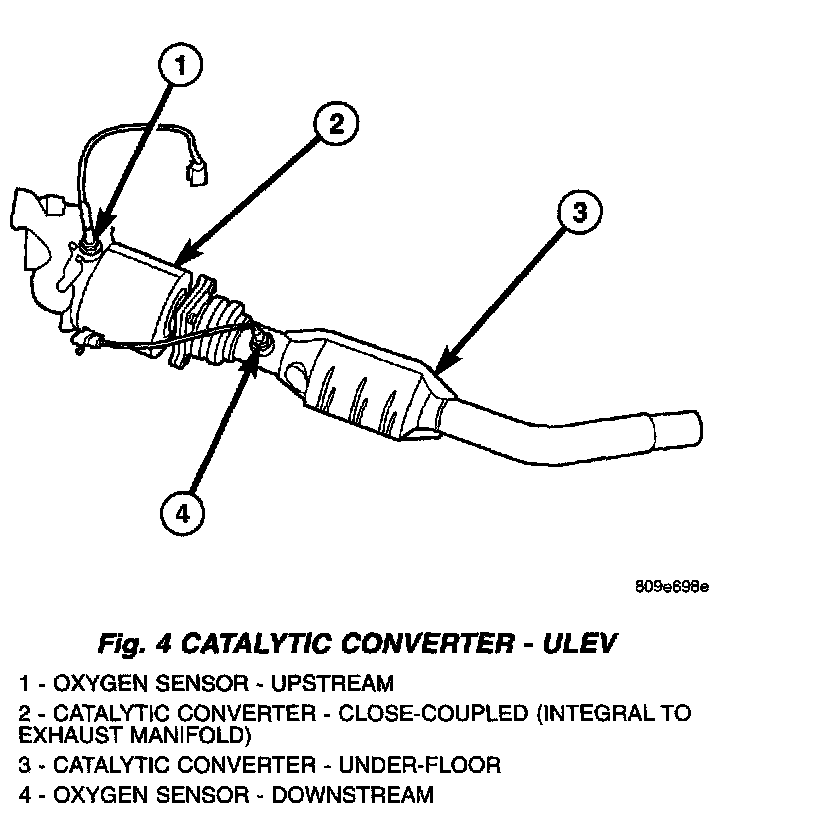 DESCRIPTIONAn under-floor catalytic converter is used on all three converter packages; National Low Emission Vehicle (NLEV), Ultra Low Emission Vehicle (ULEV), and the High Output engine. On the ULEV emission package, in addition to the under floor converter, a close-coupled catalytic converter is used. This converter is integral to the exhaust manifold