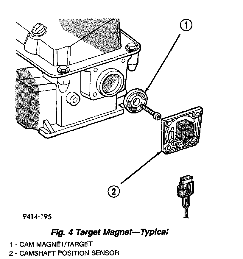 A target magnet attaches to the rear of the camshaft and indexes to the correct position. The target magnet has four different poles arranged in an asymmetrical pattern . As the target magnet rotates, the camshaft position sensor senses the change in polarity. The sensor output switch switches from high (5.0 volts) to low (0.5 volts) as the target magnet rotates. when the north pole of the target magnet passes under the sensor, the output switches high. The sensor output switches low when the south pole of the target magnet passes underneath.