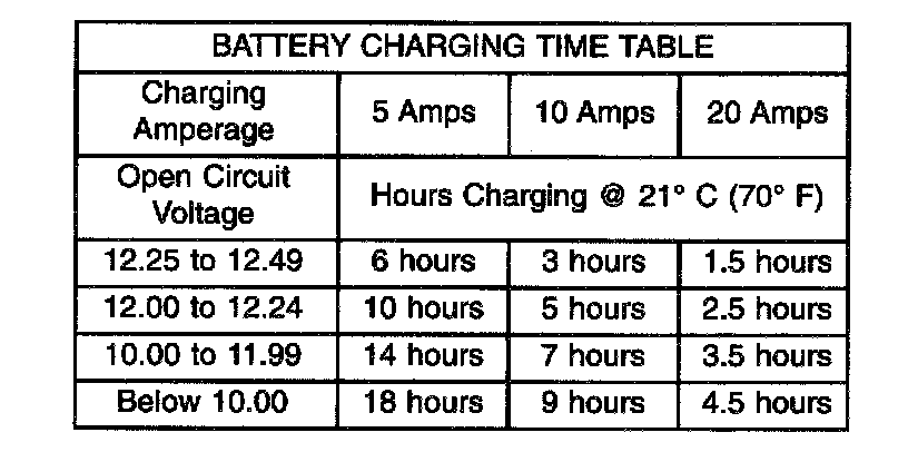 The Battery Charging Time Table gives an indication of the time required to charge a typical battery at room temperature based upon the battery state-of- charge and the charger capacity.