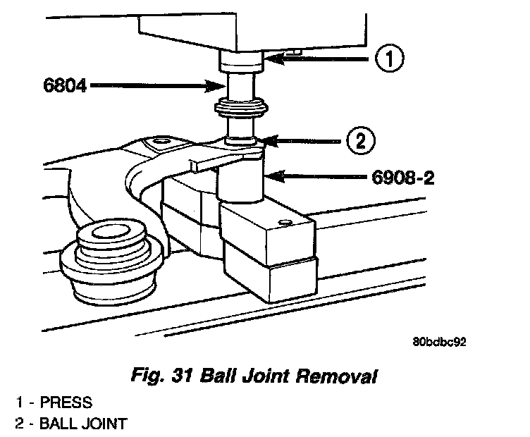 2. Position the Receiver, Special Tool 6908-2, on a hydraulic press to support the lower control arm. Place the control arm on top of Tool 6908-2 so that the bottom of the ball joint sets into the Receiver cup.
