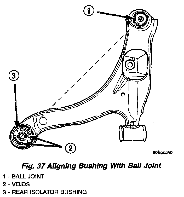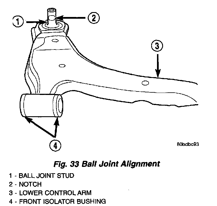 CAUTION: When installing a ball joint in its mounting hole in the lower control arm, position the ball joint so the notch in the ball joint stud is facing the lower control arm front isolator bushing. This will ease assembly of the ball joint to the steering knuckle when the installation of the pinch bolt is attempted.