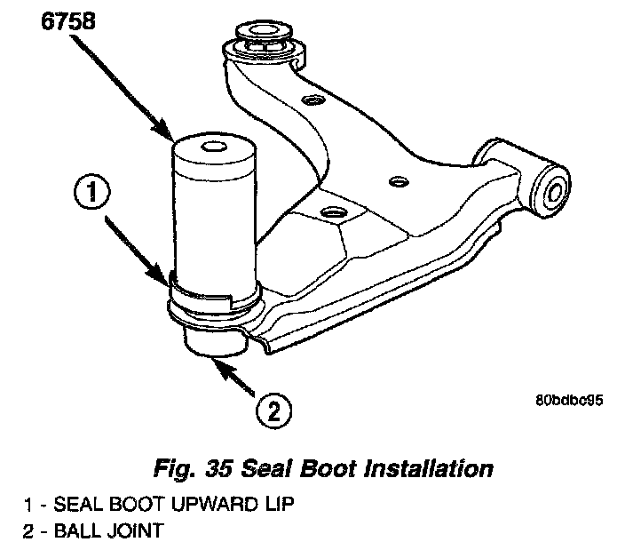 CAUTION: When installing the sealing boot on the ball joint, position the upward lip on the outside perimeter of the seal boot outward, away from the control arm once installed. It is there to help shield heat from the sealing boot.