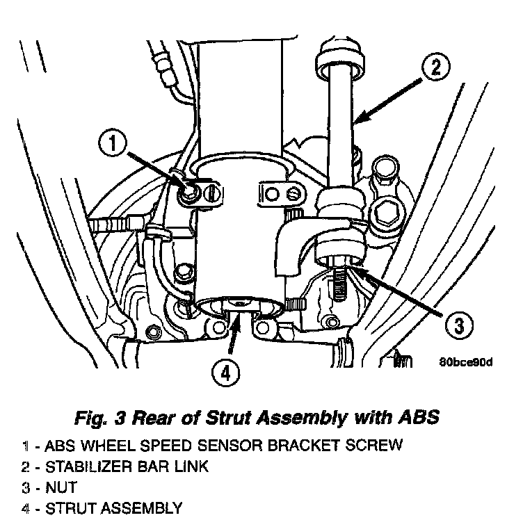 4. If the vehicle is equipped with the Antilock Brake System (ABS), remove the screw securing the ABS wheel speed sensor bracket to the rear of the strut assembly.