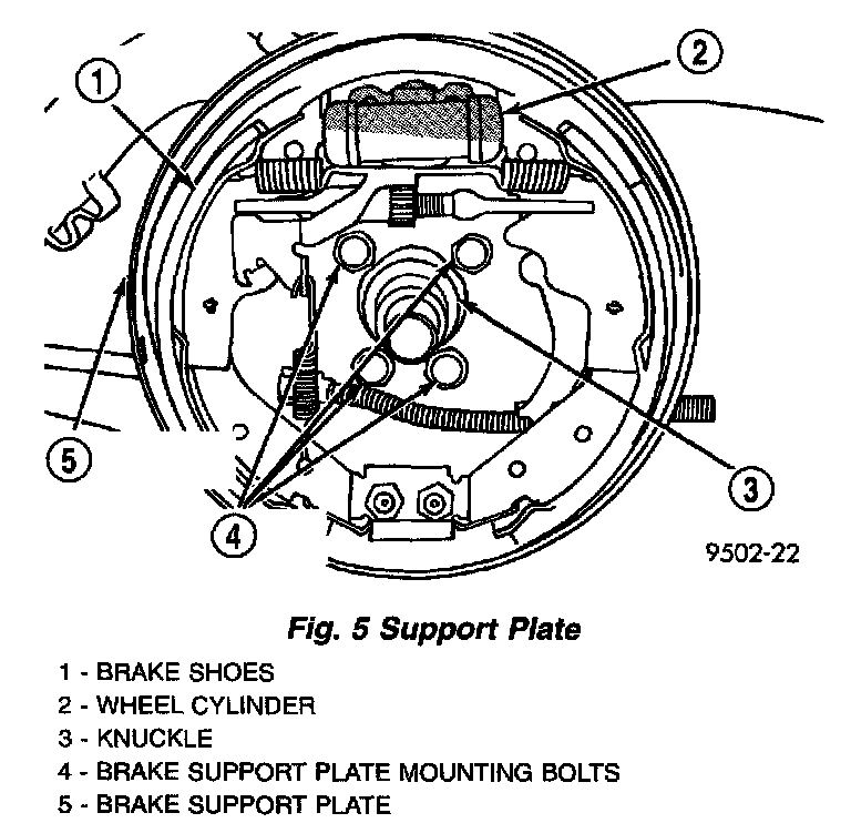 9. If vehicle is equipped with rear drum brakes, remove the four bolts attaching the rear brake support plate to the knuckle. Next, remove the brake support plate, brake shoes and wheel cylinder as an assembly from the rear knuckle, then hang it out of the way using a wire hanger or cord. Do not overextend the brake hose when being hung. It is not necessary to remove the brake hose from the wheel cylinder when removing the support plate.