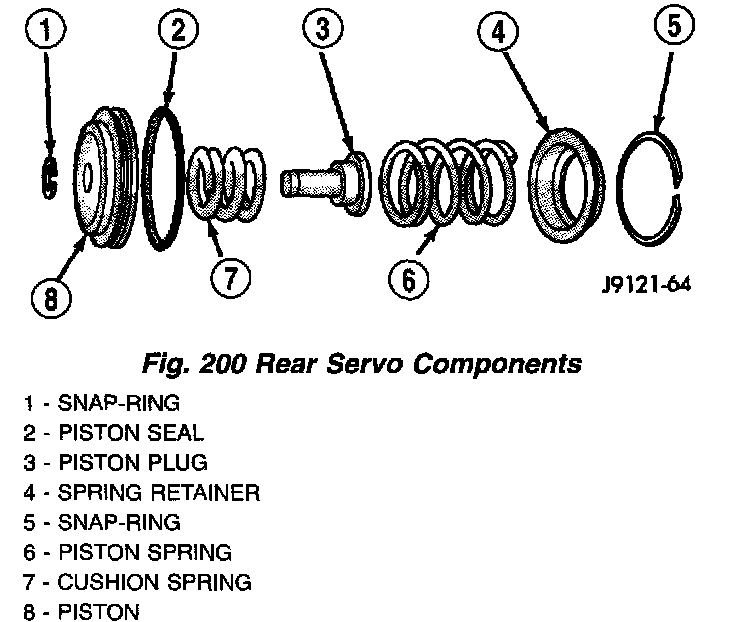Remove and discard the servo piston seal ring (Fig. 200). Then clean the servo components with solvent and dry with compressed air. Replace either spring if collapsed, distorted or broken. Replace the plug and piston if cracked, bent, or worn. Discard the servo snap-rings and use new ones at assembly.