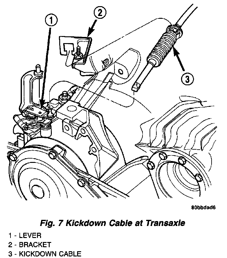 19. Install transaxle kickdown cable to bracket and lever as shown in (Fig. 7).