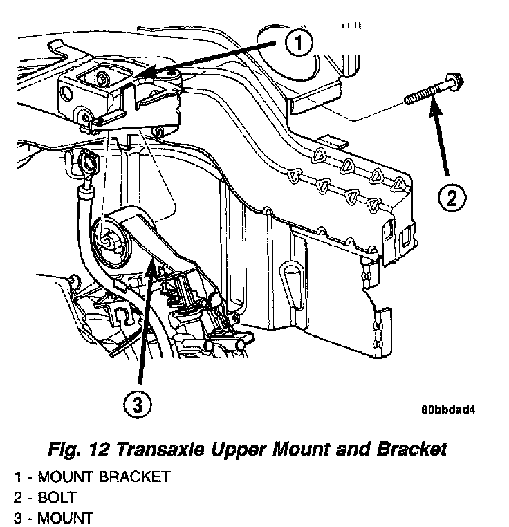 3. Raise engine and transaxle with screw jack until through hole in upper mount aligns with hole in mount bracket. Install mount bolt and tighten to 108 Nm (80 ft. lbs.) torque (Fig. 12).