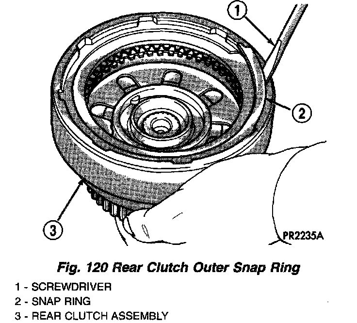 DISASSEMBLY1. Remove rear clutch snap ring (Fig. 120) (Fig. 126).