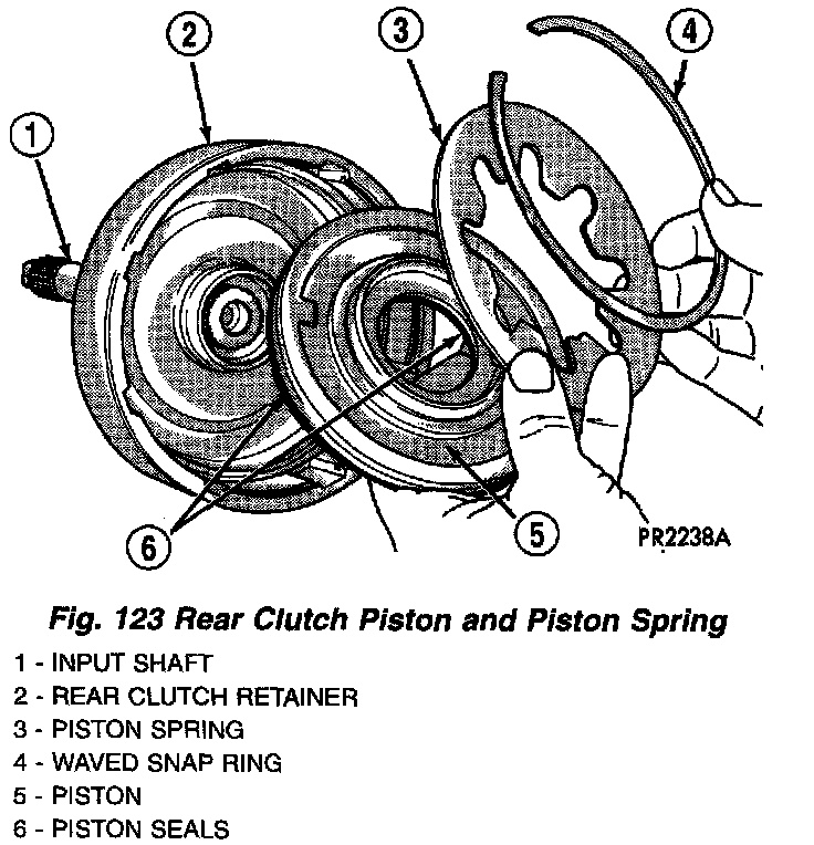 4. Remove rear clutch piston and belleville spring (Fig. 123).