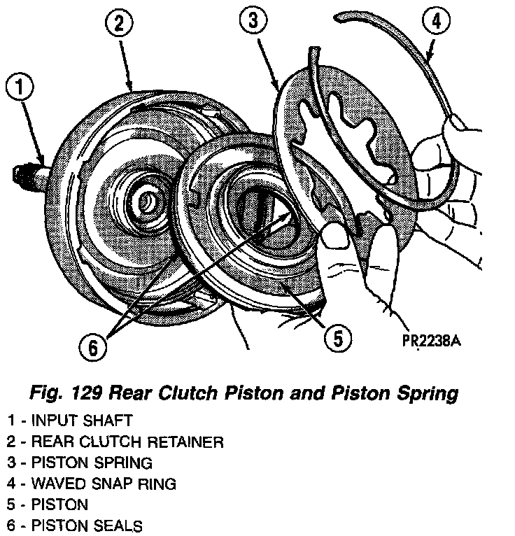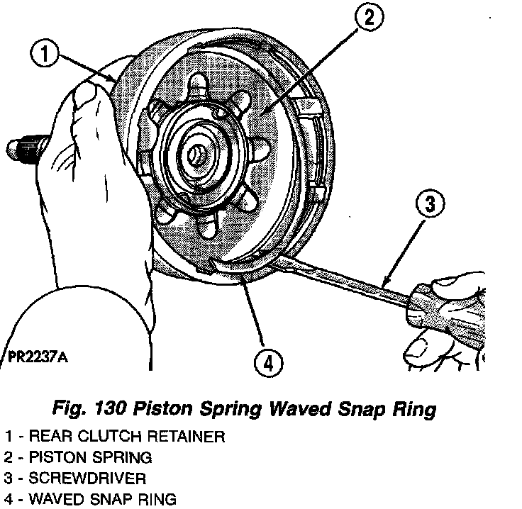 2. Install rear clutch piston, belleville spring and waved snap ring (Fig. 129). Install snap ring using a suitable screwdriver (Fig. 130).
