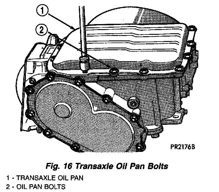 2. Remove transaxle oil pan-to-case bolts (Fig. 16).