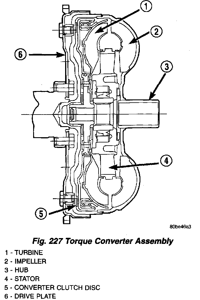DESCRIPTIONThe torque converter (Fig. 227) is a hydraulic device that couples the engine crankshaft to the transmission. The torque converter consists of an outer shell with an internal turbine, a stator, an overrunning clutch, an impeller and an electronically applied converter clutch. The converter clutch provides reduced engine speed and greater fuel economy when engaged. Clutch engagement also provides reduced transmission fluid temperatures. The converter clutch engages in third gear. The torque converter hub drives the transmission oil (fluid) pump.