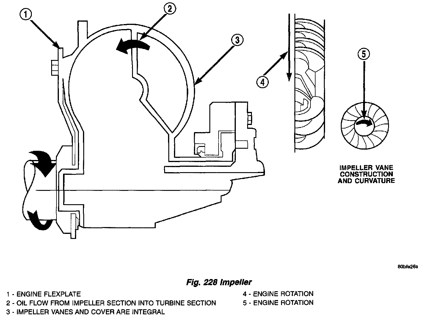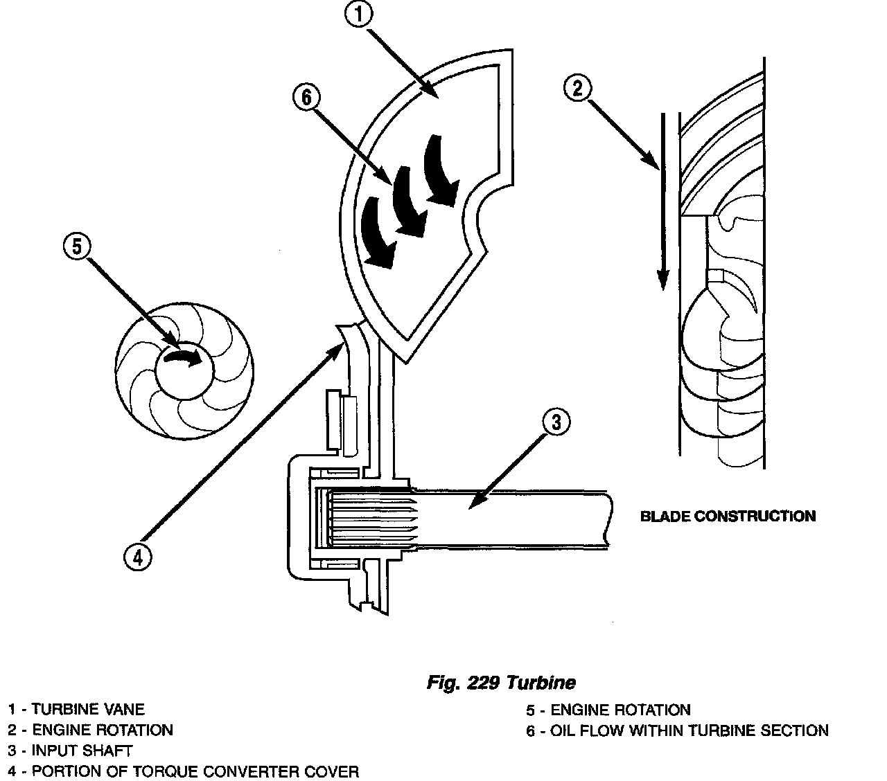 The converter impeller (Fig. 233) (driving member) which is integral to the converter housing and bolted to the engine drive plate, rotates at engine speed. The converter turbine (driven member), which reacts from fluid pressure generated by the impeller, rotates and turns the transmission input shaft.