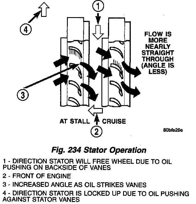 torque multiplication is achieved by locking the stator's over-running clutch to its shaft (Fig. 234). Under stall conditions (the turbine is stationary), the oil leaving the turbine blades strikes the face of the stator blades and tries to rotate them in a counterclockwise direction. When this happens the over-running clutch of the stator locks and holds the stator from rotating. With the stator locked, the oil strikes the stator blades and is redirected into a "helping" directing before it enters the impeller. This circulations of oil from impeller to turbine, turbine to stator, and stator to impeller, can produce a maximum torque multiplication of about 2.4:1. As the turbine begins to match the speed of the impeller, the fluid that was hitting the stator in such a way as to cause it to lock-up is no longer doing so. In this condition of operations, the stator begins to free wheel and the converter acts as a fluid coupling.
