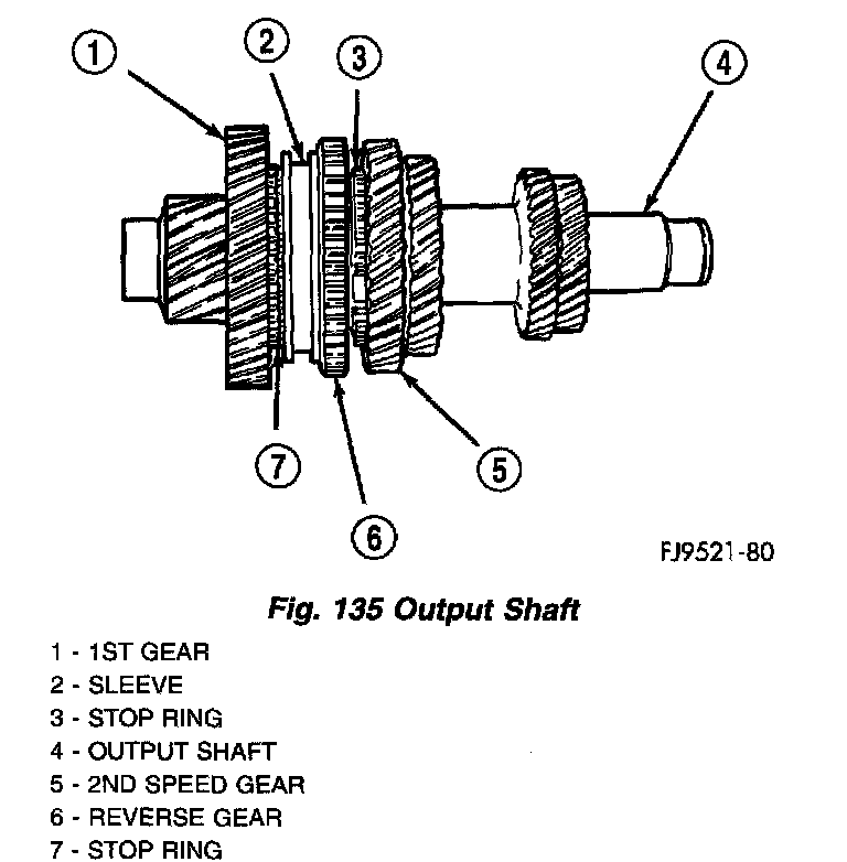 The output shaft incorporates the 1st and 2nd gears and synchronizers on the assembly (Fig. 135).