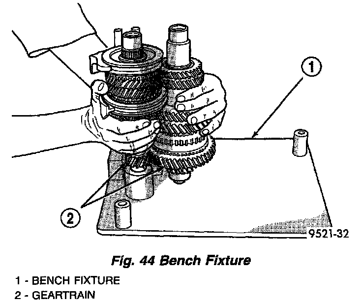 1. Verify bench fixture shims are removed from bench fixture. Install output and input shafts into bench fixture (Miller tool #6785) (Fig. 44).