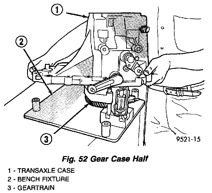 9. Install gear-case half over bench fixture (Fig. 52). Line up shift finger over 3-4 lug.