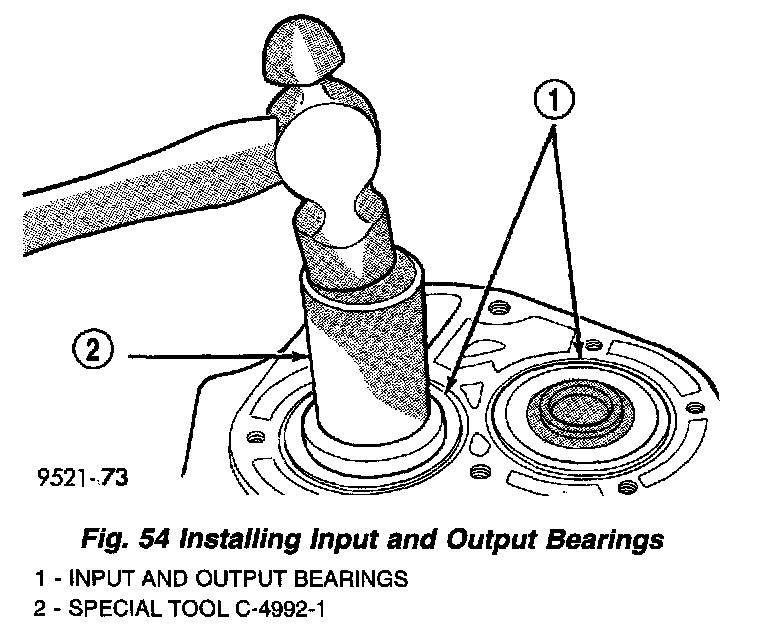 11. Position input and output bearings on the shafts. Using Miller tool C-4992-1, press on input and output shaft bearings until they bottom into the case and against the shafts (Fig. 54).