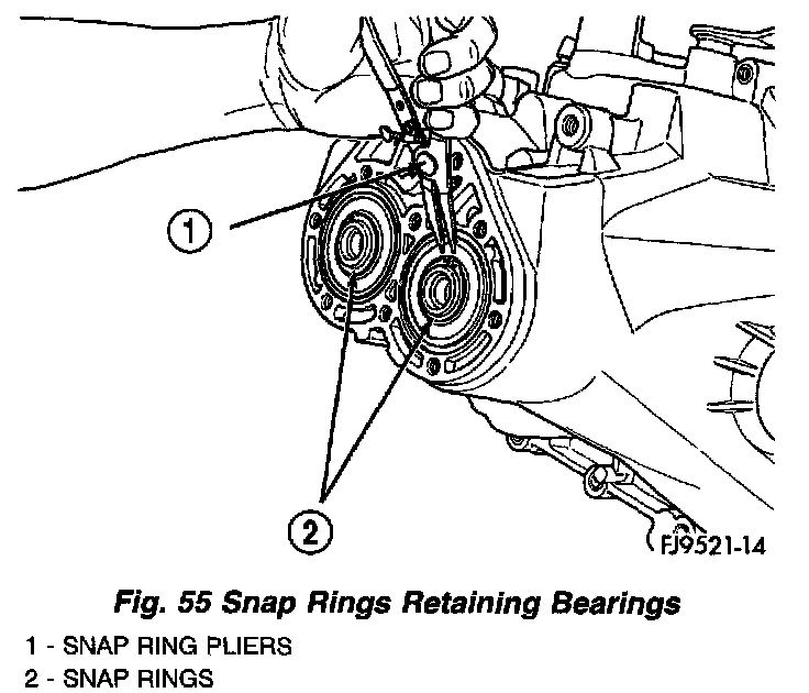 12. Install shaft snap rings at input and output bearings (Fig. 55).