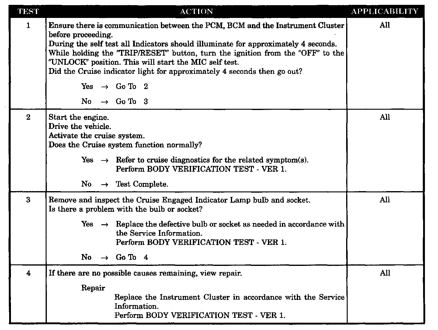 CRUISE ENGAGED INDICATOR NOT OPERATING PROPERLY