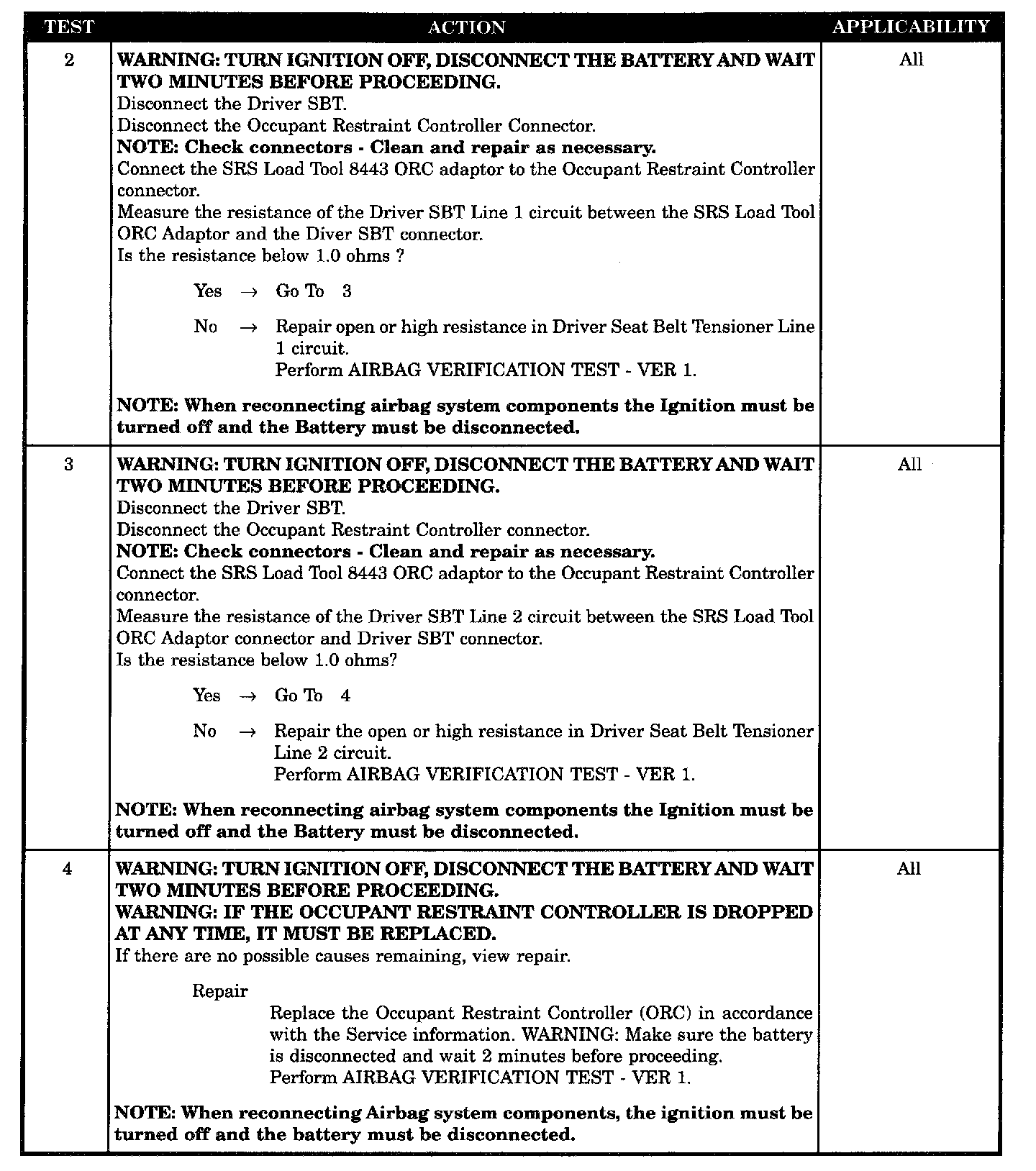 When the ignition is ON, the ORC monitors the resistance of the Driver Seat Belt Tensioner circuits.