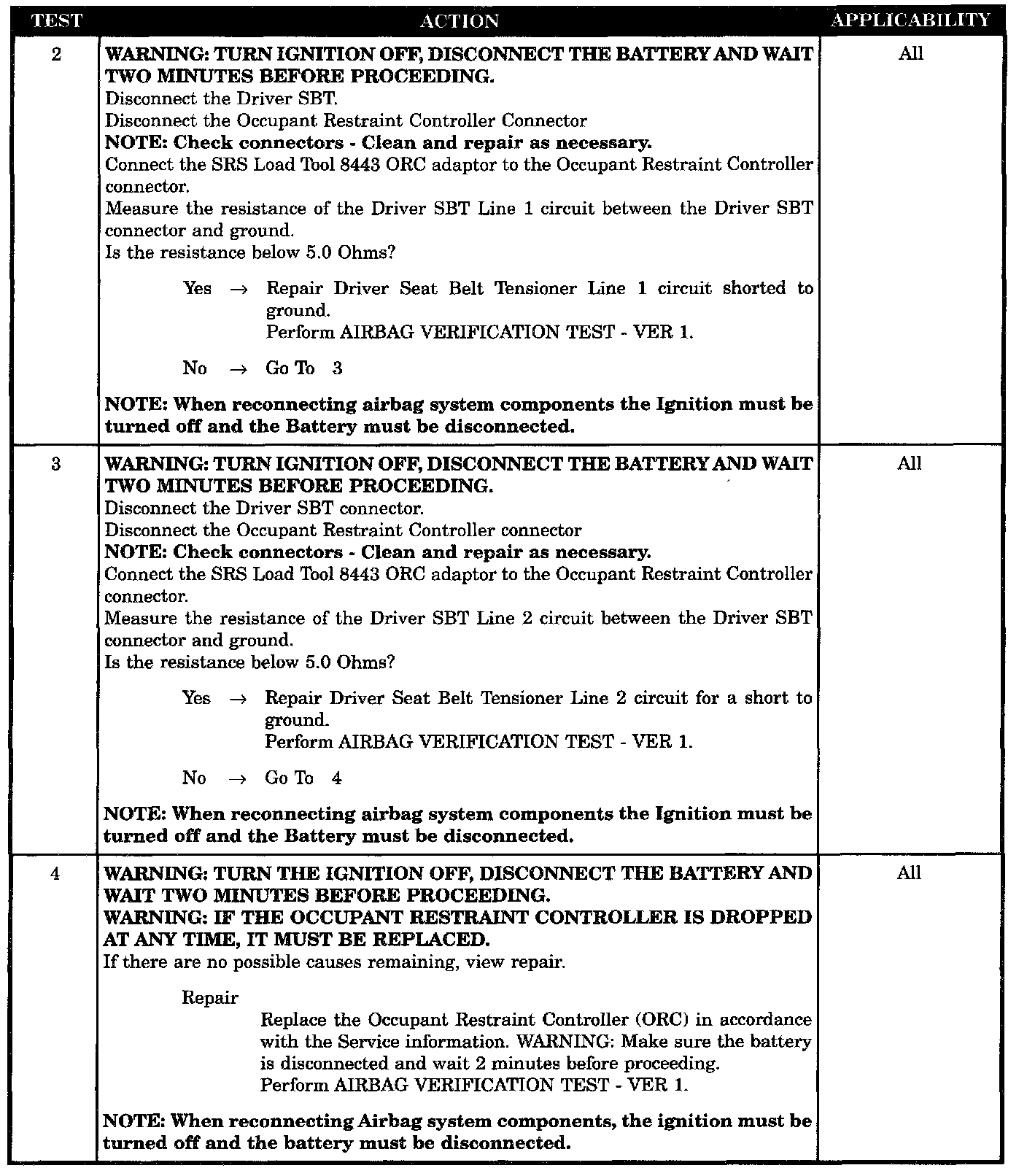 When the ignition is ON, the ORC monitors the voltage of the Driver Seat Belt Tensioner circuits.