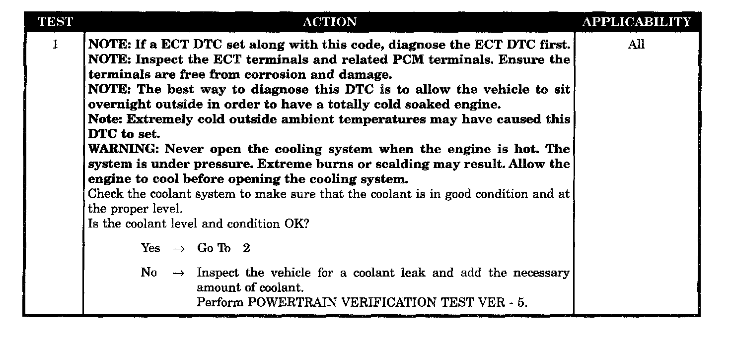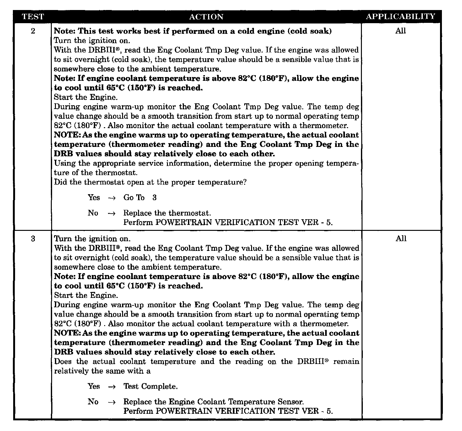 The engine temperature does not go above 45 °F (7 °C). F Time dependants on start-up coolant temperature and ambient temperature. (i.e. 2 minutes for a start temp of 10 °C (50 °F) or up to 10 minutes for a vehicle with a start-up temp of -28 °C (20 °F). Two trips are required to set this DTC.