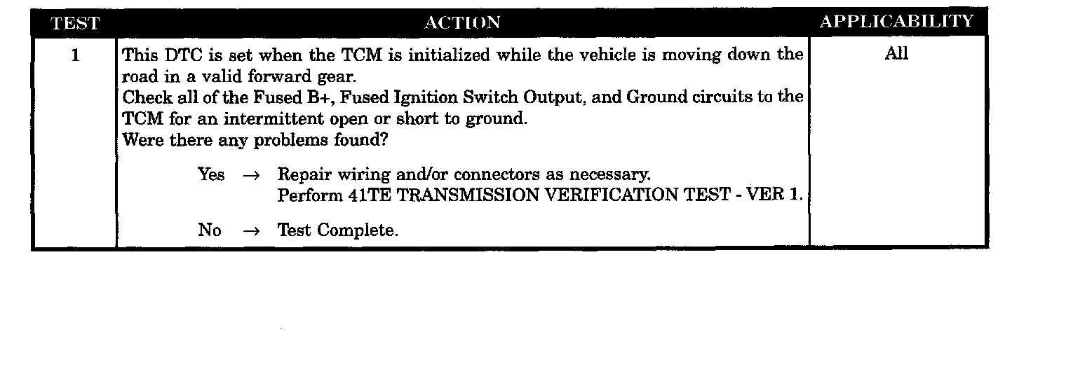 Set Condition: If the TCM powers up and senses a valid forward gear PRNDL DTC and the Output RPM is above 800 RPM (approximately 32 Km/h or 20 MPH) then the DTC will set.