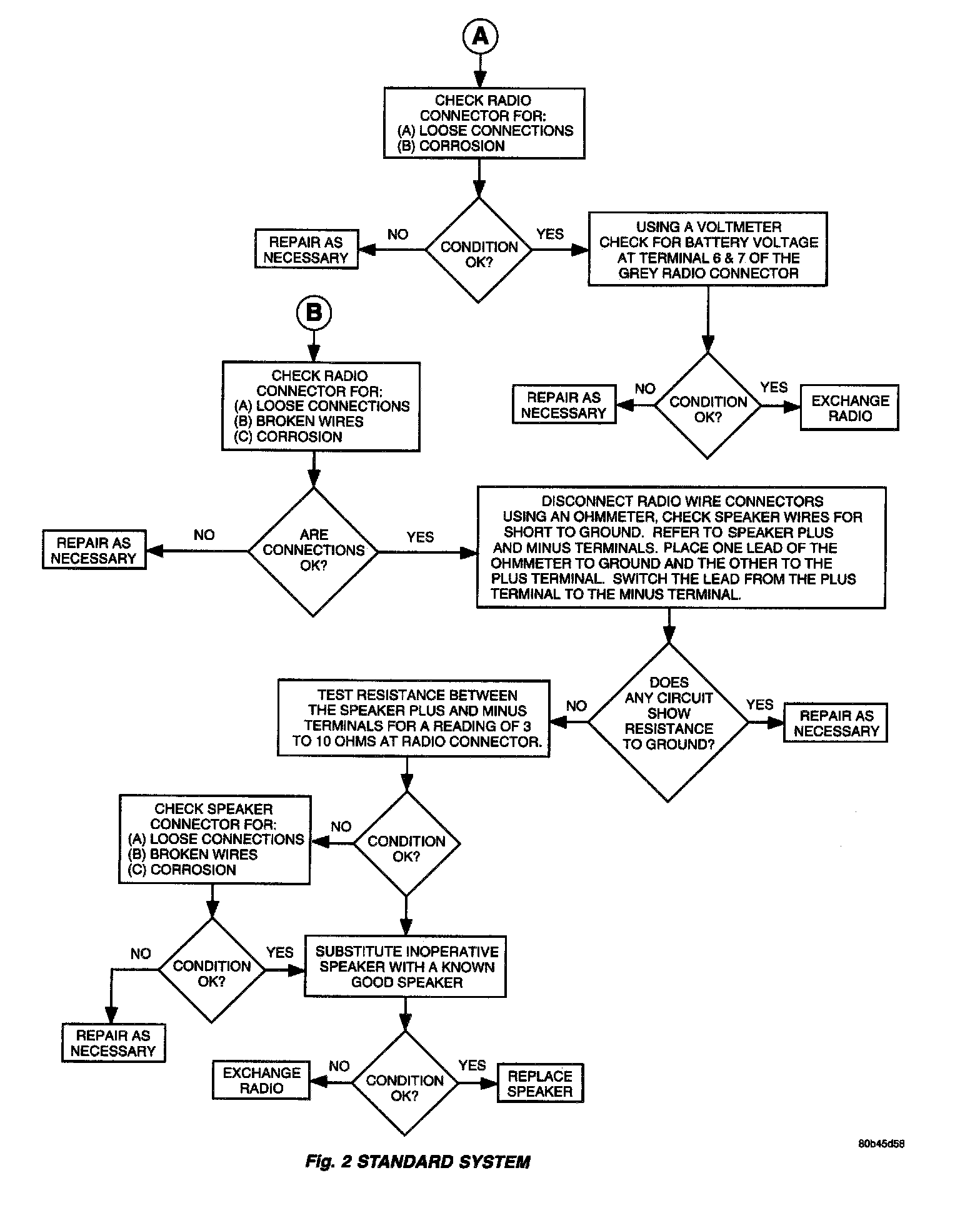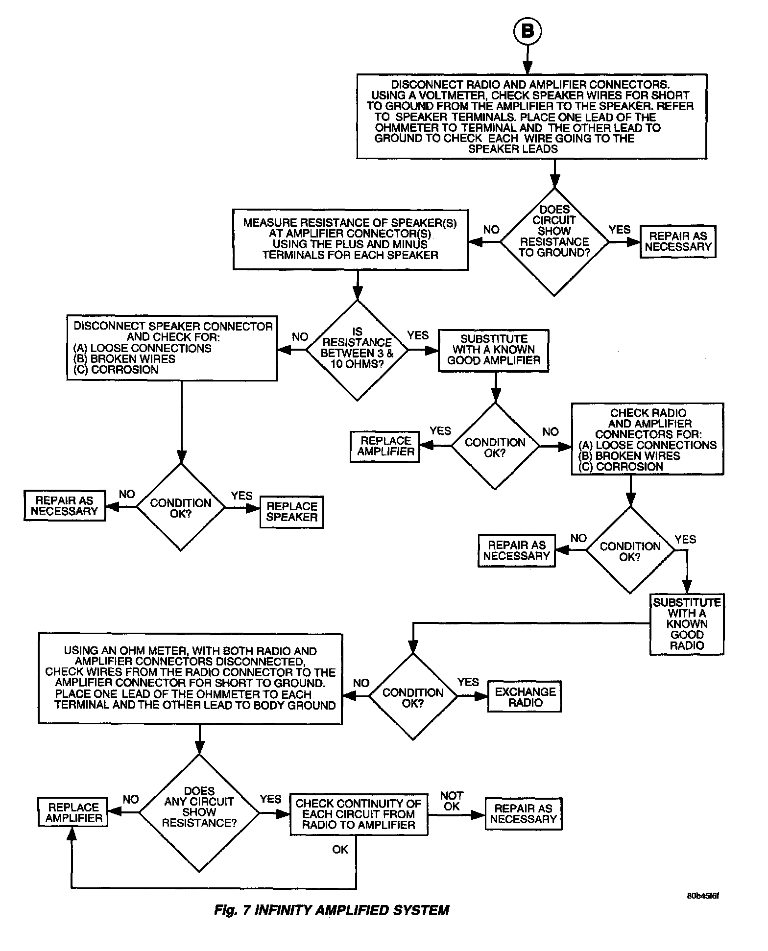 - Remove output signal connector to the speaker. Check each wire connector to the speaker for resistance.
