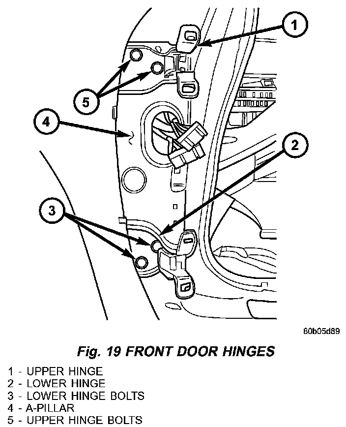 2. Loosely install bolts attaching hinge to lower A-pillar (Fig. 19).