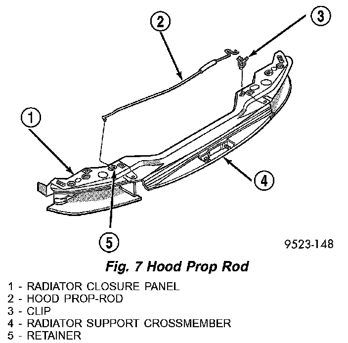 3. Disengage prop-rod from retainer attaching prop-rod to radiator closure panel (Fig. 7).