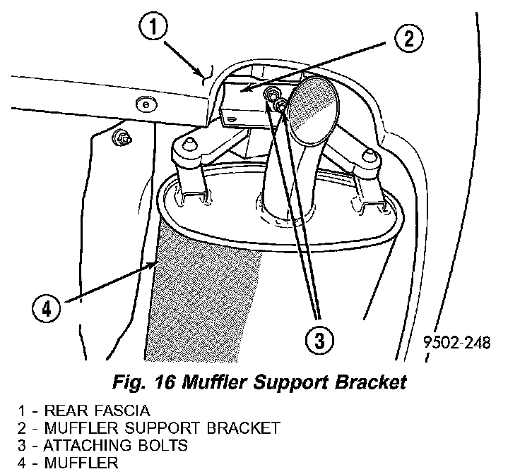 9. Install muffler support bracket on rear frame rail (Fig.16). Install rear exhaust pipe hanger on rear suspension crossmember (Fig.17).