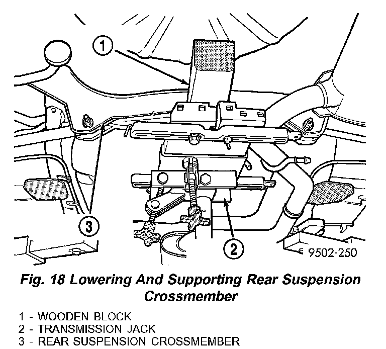 6. Position a transmission jack and wooden block under the center of the rear suspension crossmember to support and lower crossmember during removal (Fig.18).