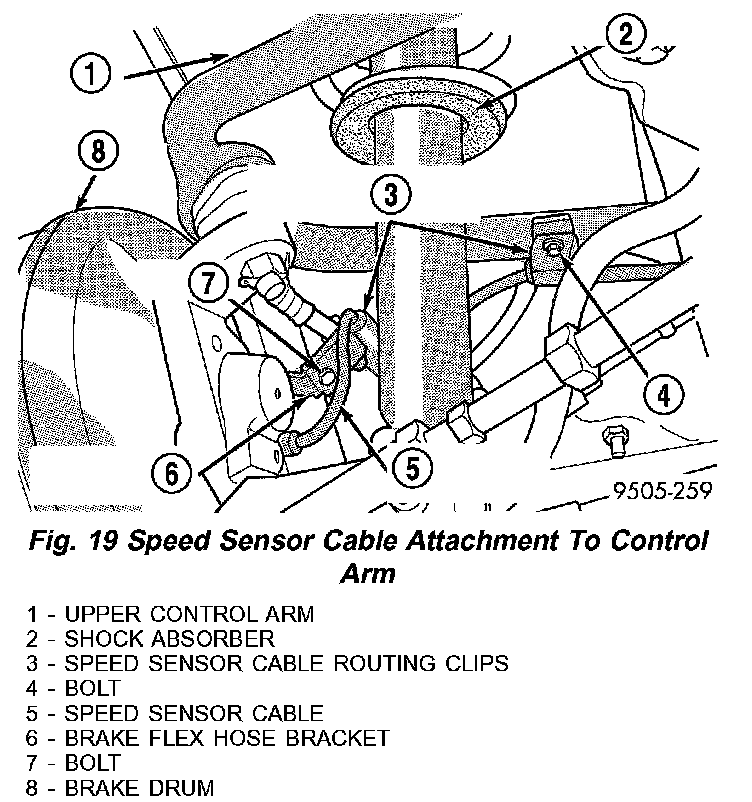 7. If vehicle is equipped with antilock brakes, remove routing clips for wheel speed sensor cable from brackets on upper control arm (Fig.19).