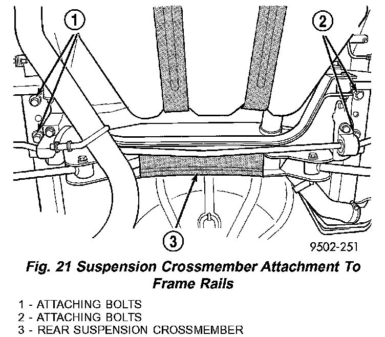 10. Remove the 4 bolts attaching the rear suspension crossmember to rear frame rails (Fig. 21).