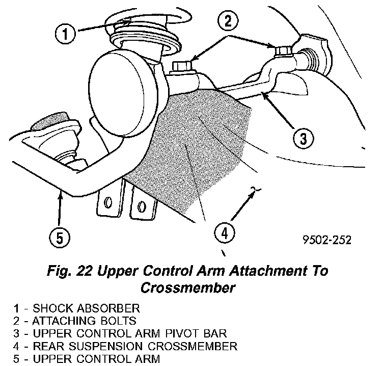 11. Lower the rear suspension crossmember enough to access the upper control arm pivot bar to crossmember attaching bolts (Fig.22). Remove the 4 bolts attaching the upper control arms to the suspension crossmember. Remove the control arms from the crossmember.